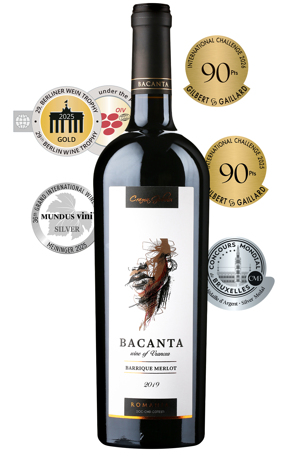 Bacanta Merlot Barrique este un vin roșu sec, recolta 2019, maturat minimum 18 luni în baric și 6 luni în sticlă, pentru complexitate, eleganță și profunzime, îmbuteliat la 0.75L, produs în Vrancea, România, de Crama Girboiu.