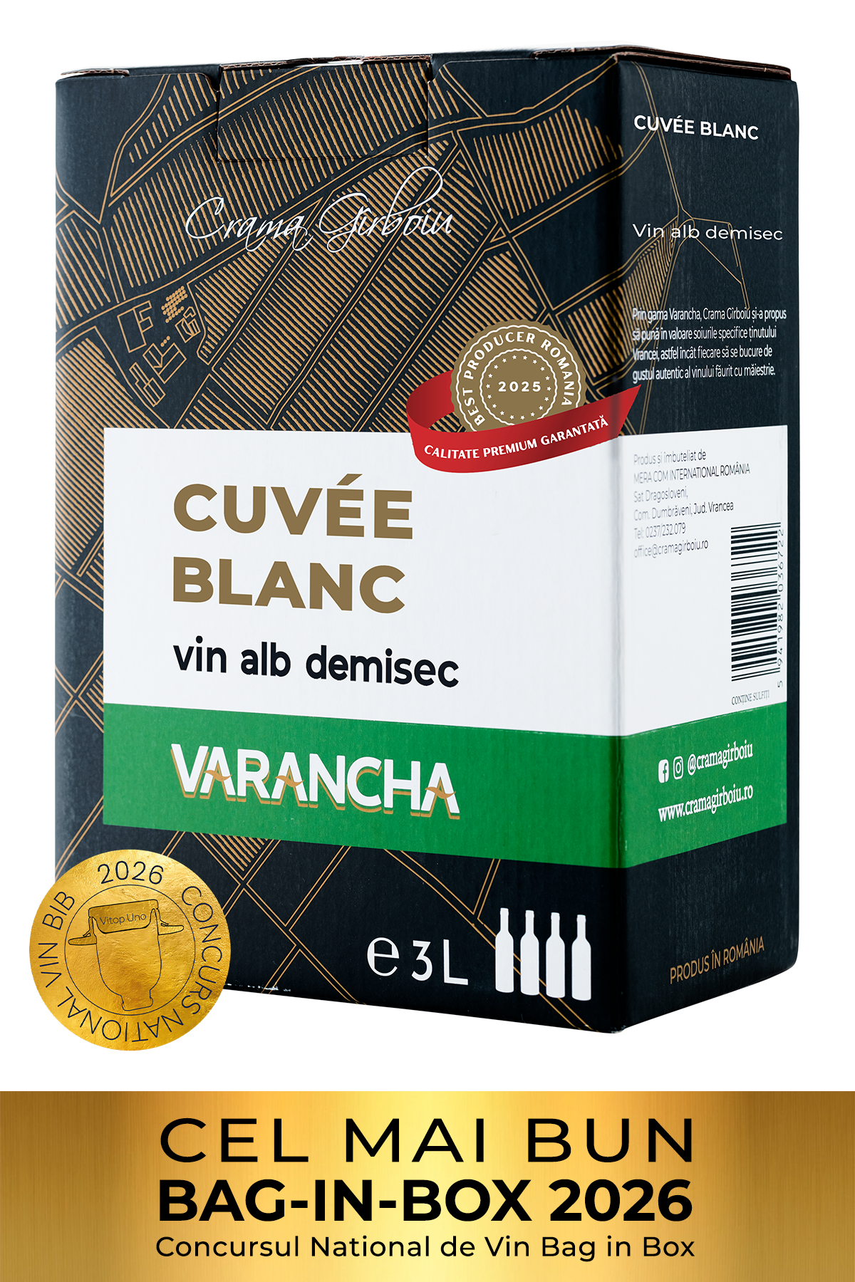 Varancha Cuvee Blanc Bag in box 3L – Vin alb demisec este un cupaj inedit de Sauvignon Blanc, Feteasca Regala si Muscat Ottonel cu o aroma pregnanta de ananas, pere zemoase si smochine. Corp mediu, aciditate crocanta si post gust proaspat si revigorant.