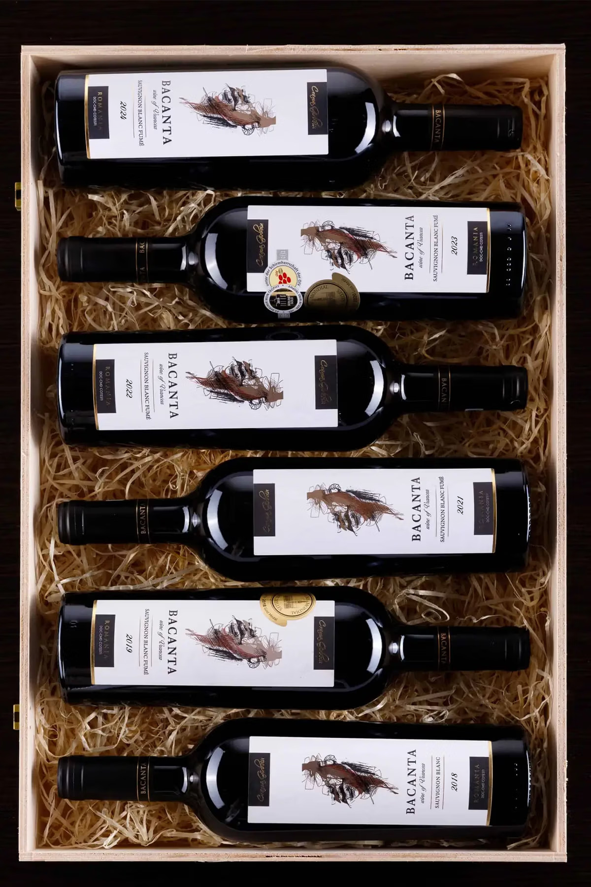 O colectie cu adevarat impresionanta pentru pasionatii de vinuri albe. Aceasta colecție Verticala Bacanta Sauvignon Blanc Fume va da prilejul de a incerca un in 6 ani de exceptie: 2018, 2019, 2021, 2022, 2023 si 2024. Fiecare sticla confera evolutia energica a vinurilor si a terroir-ului Vrancean, cat si priceperea enologilor si a intregii echipe de la Crama Girboiu.